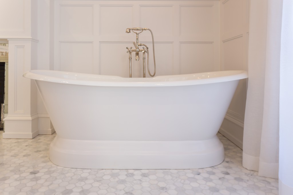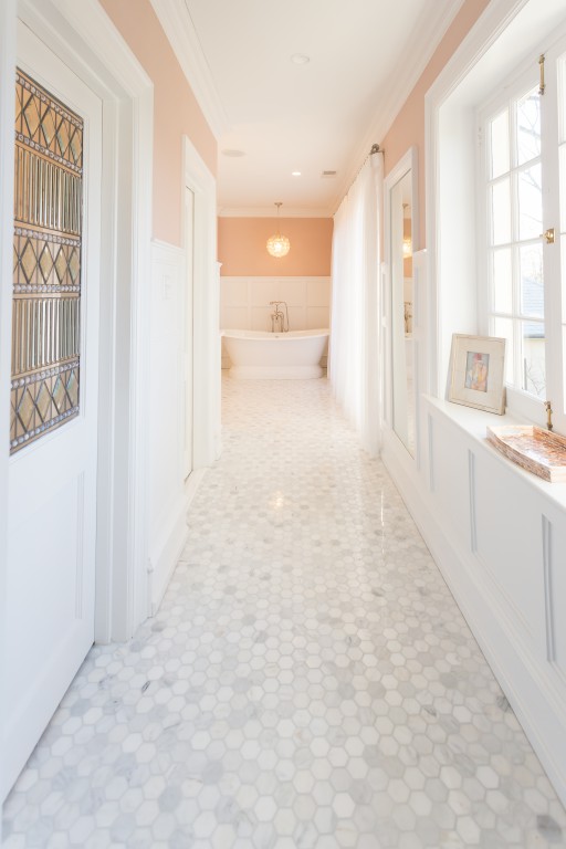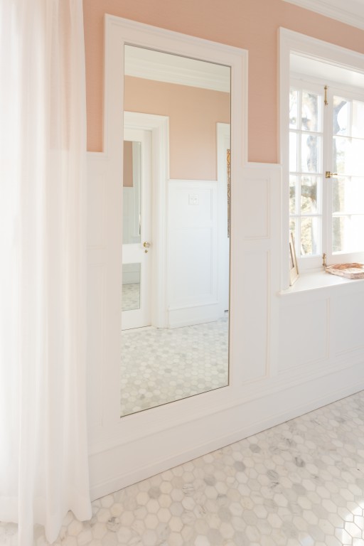 The master bathroom was remodeled in the 90’s and there were mirrors everywhere. Literally every wall covered in mirrors. We got rid of them and transformed this space into an elegant bathroom that will stay timeless. Radiant floor heat feels amazing on your feet in this bathroom!